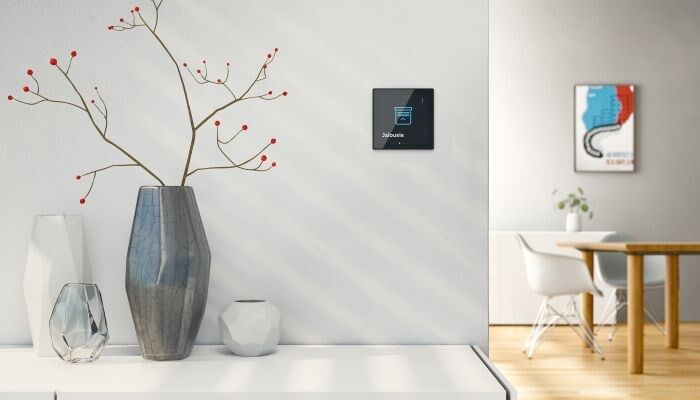 Das innovative 4“-Display ist in den Farben Weiß und Schwarz erhältlich. Dank seines modernen und flachen Designs fügt es sich perfekt in jede Umgebung ein. Der Multisensor dient nicht nur zur Steuerung der Beleuchtung und Jalousien, sondern verfügt auch über einen integrierten Raumtemperaturregler.