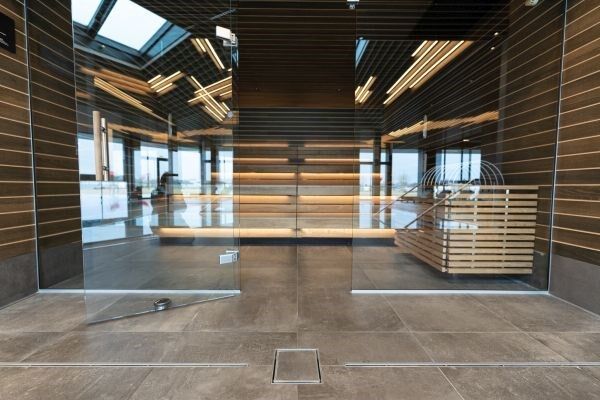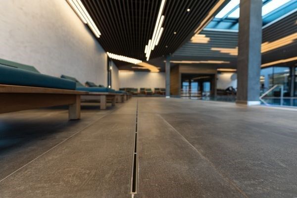 Im hochwertigen und modernen 4000m² Spa-Bereich entwässert die ACO Badschlitzrinne S8 hochprofessionell und zugleich unauffällig. Sie überzeugt mit schlichtem Design und individueller Längenanpassung. Das hochwertige Material (Edelstahl 1.4301 bzw. 1.4404) garantiert höchste Stabilität und Qualität. Die Badschlitzrinne ist begehbar und rollstuhlbefahrbar. Durch ihre schmale Bauweise bietet sie auch eine hohe Abflussleistung, die für eine effektive Entwässerung von Duschbereichen, Whirlpools und Saunen sorgt. Dank des einfachen Zugangs zum Abfluss ist sie zudem leicht zu reinigen und zu warten.
