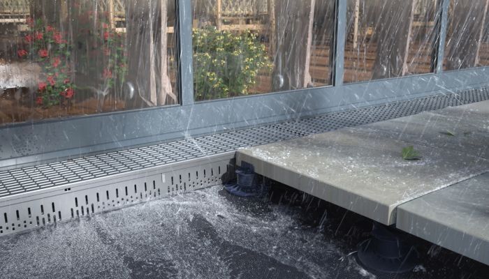 Beim System Profiline 2.0 erfolgt die Ableitung von Regenwasser über die perforierte Seitenwand, die das Wasser unterhalb von Plattenbelägen auf Stelzlagern oder direkt in die Dränschicht führt. Die Rinnen sind beidseitig perforiert, wodurch angestautes Wasser und Feuchtigkeit schnell und sicher abgeleitet werden können. Durch die Auswahl verschiedener Rostdesigns lässt sich die Entwässerungslösung technisch und gestalterisch an das jeweilige Projekt anpassen.