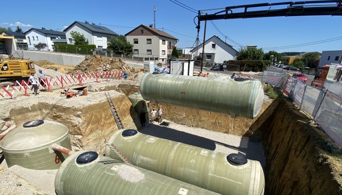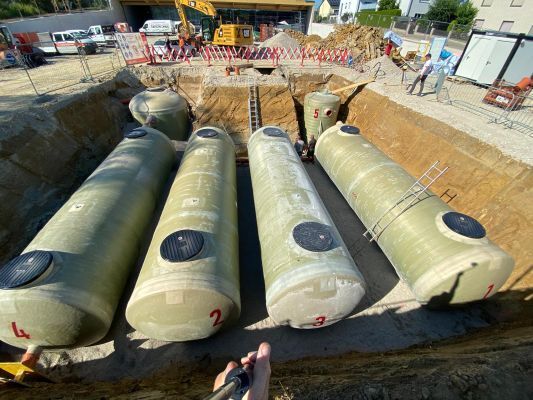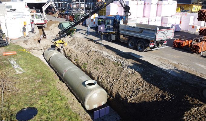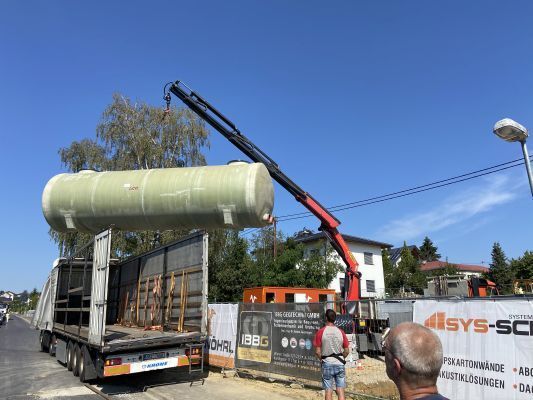 Einbau eines Fertigteilbehälters aus glasfaserverstärktem Kunststoff: