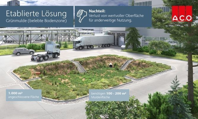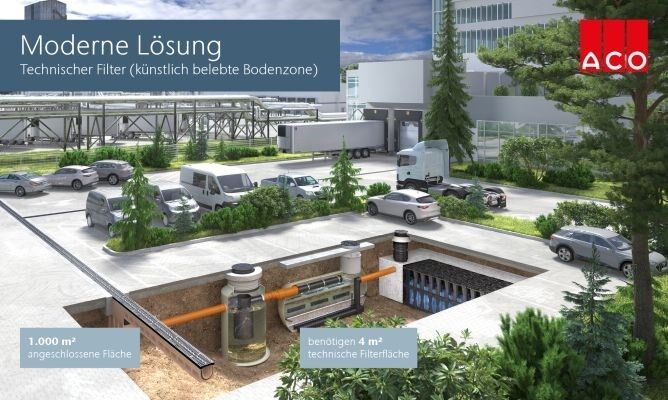 Zum Schutz der Umwelt sollte Regenwasser, das von Verkehrsbereichen aufgenommen wird, gesäubert werden, ehe es im Boden versickert oder in Gewässer abgeleitet wird. Häufig geschieht dies durch den Einsatz von Grünmulden, die jedoch rund 10 - 20 % der angeschlossenen Fläche benötigen, wodurch wertvolle Oberfläche verloren geht. Die fortschrittliche Alternative: das ACO Stormclean TF-System (TF = technischer Filter).