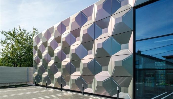 Besonders hervorzuheben ist die Unterkonstruktion, die die nahtlose Integration der 3D-Kassetten ermöglicht. Dieses System hat keine sichtbaren Schrauben oder Befestigungselemente, die die homogene Erscheinung der Fassade stören. Das Ergebnis ist eine makellose Oberfläche, die durch ihre plastische Tiefenwirkung und Farbwechsel besticht.