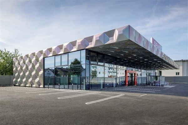 Die 3D-Kassetten verleihen der Fassade eine dynamische Optik und ein Spiel aus Licht und Schatten, das sich mit dem Tagesverlauf verändert. Zusätzlich wurde eine Led-Beleuchtung integriert, welche zu Abendstunden ein außergewöhnliches Erscheinungsbild schafft. Diese architektonischen Elemente machen den neuen SPAR-Markt in Wallern zu einem echten Blickfang.