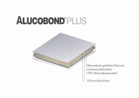 ALUCOBOND® plus wurde speziell für höhere Anforderungen beim Brandschutz in der Architektur entwickelt. Durch den mineralischen Kern erzielt ALUCOBOND® plus höhere Brandklassifizierungen. Es ist schwer entflammbar und bietet die bewährten Produkteigenschaften der ALUCOBOND®-Familie wie u.a. Planheit, Verformbarkeit, Witterungsbeständigkeit und einfache Verarbeitung.