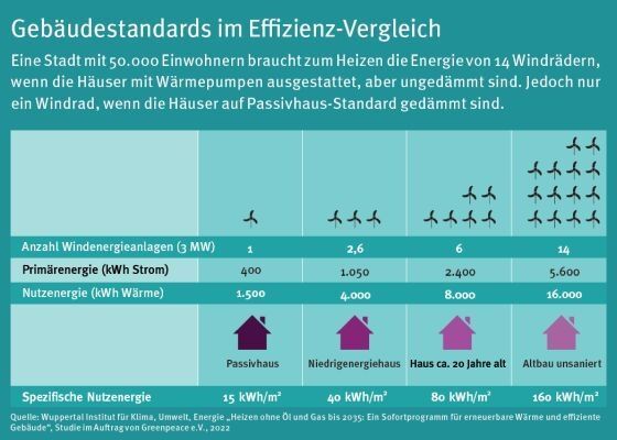 Laut einer Studie von 14malbesser.at benötigt eine Stadt mit 19.000 Haushalten und ungedämmten Gebäuden die Energie von 14 Windrädern, um ihre Wärmepumpen zu betreiben. Sind die Gebäude auf Passivhaus-Standard gedämmt, reicht ein einziges Windrad. Effektive Dämmung kann den Energiebedarf also um das 14-Fache senken.