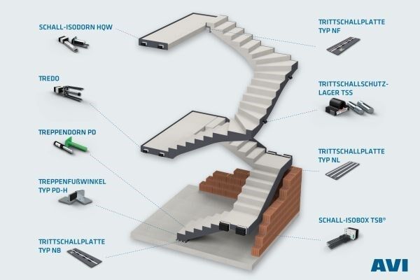 Die wohl am häufigsten schalltechnisch getrennten Bauteile sind Treppen und Podeste, unabhängig davon, ob sie als Fertigteil oder in Ortbetonbauweise hergestellt werden. Das Sortiment der AVI bietet Ihnen für sämtliche Anwendungsfälle bei Treppen leistungsfähige Lösungen sowohl in Bezug auf die schalltechnische Trennung als auch in Bezug auf die Tragfähigkeit. Die Produkte sind normativ geprüft und erfüllen alle Anforderungen der Regelwerke hinsichtlich des maximal zulässigen bewerteten Standard-Trittschallpegels.