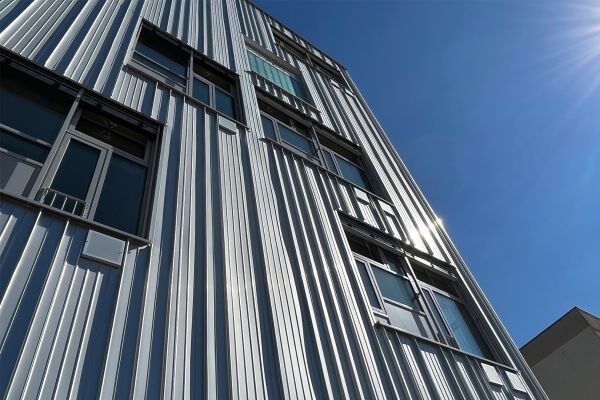 Der Einsatz von Aluminium-Stehfalzprofilen für die Fassade bietet zahlreiche Vorteile. Aluminium zeichnet sich durch seine hohe Korrosionsbeständigkeit und Langlebigkeit aus, was es besonders für den Einsatz in Gebieten mit starken Witterungs- und Umwelteinflüssen geeignet macht. Das geringe Gewicht des Materials ermöglicht eine zügige und unkomplizierte Installation. Gleichzeitig überzeugt Aluminium durch seine gestalterische Vielseitigkeit – die unterschiedlichen Profilbreiten und die vertikale Anordnung schaffen eine dynamische Fassadenstruktur, die Funktionalität und modernes Design vereint. Ein weiterer Vorteil ist die Nachhaltigkeit des Materials: Aluminium ist vollständig recycelbar und trägt so zu einem reduzierten ökologischen Fußabdruck des Gebäudes bei. Die BEMO Stehfalzfassade garantiert, dass das Schulgebäude über viele Jahre hinweg sowohl optisch als auch funktional auf höchstem Niveau bleibt.