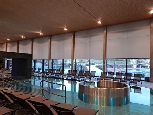 Durch die hohe Luftfeuchtigkeit und Chlorgehalt in der Luft besteht in Schwimmbädern eine besonders hohe Anforderung an die Sonnenschutzanlagen. Die Bauteile und textilen Behänge dieser Systeme müssen speziell behandelt und sehr widerstandsfähig sein.
