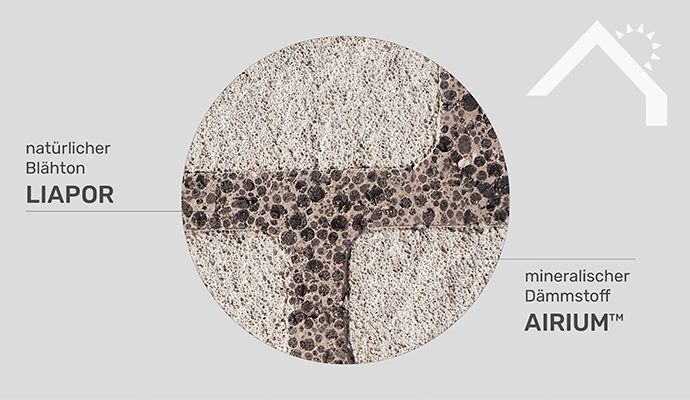 Der innovative Materialaufbau des LiaNatura 38 besteht aus rein mineralischen Rohstoffen, wie z. B. aus natürlichem Ton, veredelt zu Liapor-Blähton und dem zukunftsweisenden Dämmstoff AIRIUM™. Dieser mineralische Isolationsschaum mit eingeschlossenen Luftporen sorgt für hervorragende Dämmleistung und macht den Einsatz erdölbasierter Außendämmungen überflüssig.