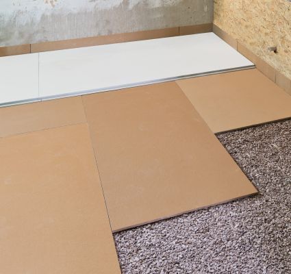 Der Fußboden war besonders herausfordernd, da der Aufbau so leicht wie möglich sein sollte. Im Bestand war eine Holzbalkendecke mit einer klassischen 25 mm starken Feder-Nute Schalung aus Fichtenholz. Um alle Anforderungen zu erfüllen, fiel die Wahl auf einen Fußbodenaufbau aus 80 bis 120 mm trockener Ausgleichsschüttung CW2000 von Cemwood. Als Abdeckung dient eine 10 mm Holzweichfaser-Platte mit einer möglichen Druckspannung von bis zu 150 k/pa. Darüber wurden 20 mm Norit-Trockenestrichplatten verlegt – unter den Fliesen von Bädern und Gäste-WCs in einer Stärke von 25 mm. Hochwertiges Vinyl als Oberbelag bildet den Abschluss.