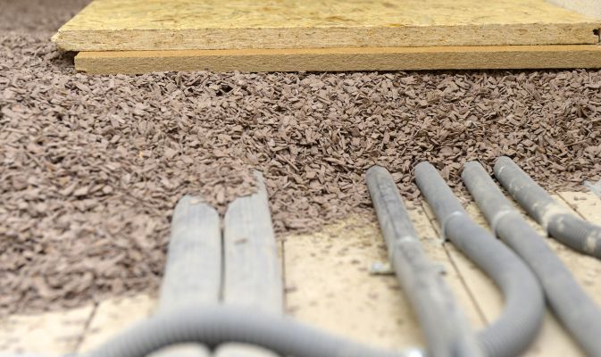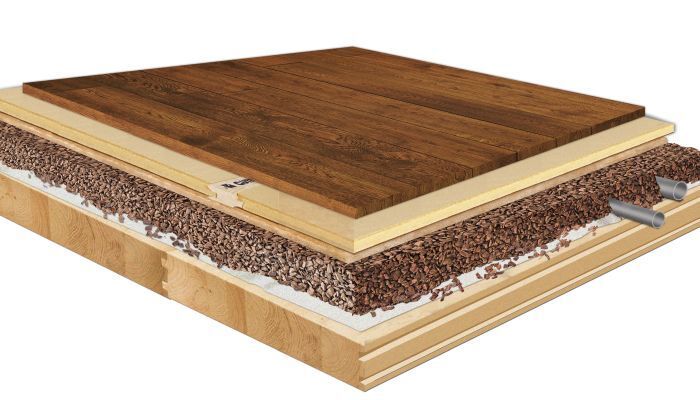 CEMWOOD-Ausgleichschüttungen werden hierbei lose bis 200mm Einbauhöhe eingebracht und sind hoch setzungssicher. Gleichzeitig bedingt die Mineralisierung die Dauerhaftigkeit der Schüttungen und sorgt dafür, dass CEMWOOD-Ausgleichsschüttungen als schwer entflammbar klassifiziert sind und somit ein Maximum an Brandschutz für holzbasierte Baustoffe beinhalten. Weiter ergänzt werden diese Eigenschaften durch eine geringe dynamische Steifigkeit der Schüttung, die in Kombination mit den weiteren Aufbaukomponenten, zu einer effektiven Trittschallminderungen beiträgt.