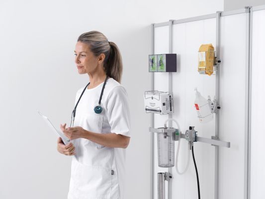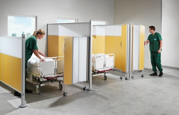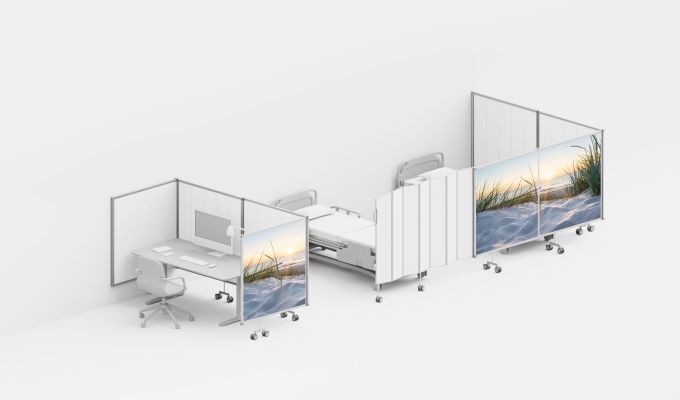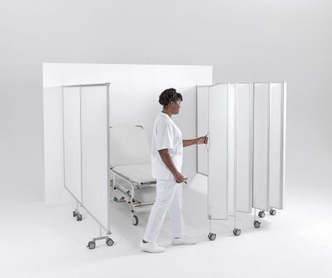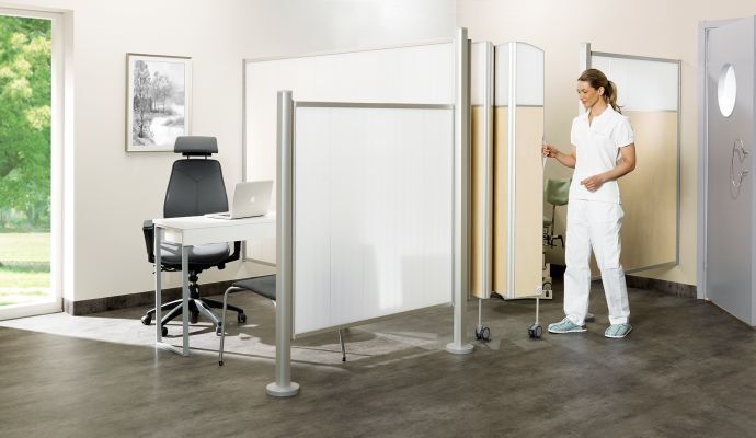 an der Wand montierte Abschirmung verfügt über ein um 90° drehbares stabiles Rollengestell. Durch die Drei-Wege-Verbindung kann der Semifix Paravent in vier verschiedene Richtungen aufgebaut werden.