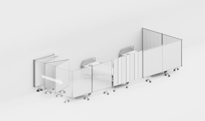Das PopUp Hospital entstand im Zuge der Pandemie, um kurzfristig temporäre sichere Patientenumgebungen zu schaffen. In der Box sind alle notwendigen Teile enthalten, der Aufbau ist selbsterkärend. Das Set eignet sich für unterschiedlichste Notsituationen, aber auch für sämtliche Umgebungen, wo plötzlich der Bedarf an Privatsphäre gegeben ist - etwa auf Flughäfen oder anderen öffentlichen Plätzen. Die Boxen können hinsichtlich Höhe und Länge der Elemente, aber auch Druck oder Farbe individualisiert werden.