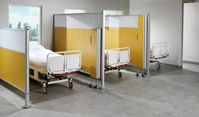 Jede Standard-Holzbox besteht aus 16 Wandelementen, einer Startstange und 17 Rollenelementen. Daraus lassen sich vier Bettenbereiche oder sieben Impfkabinen aufbauen. Zur Erweiterung bietet sich die Silentia Faltwand an. Nach dem Gebrauch kann alles wieder in der stapelbaren Kiste auf der Palette verstaut werden.