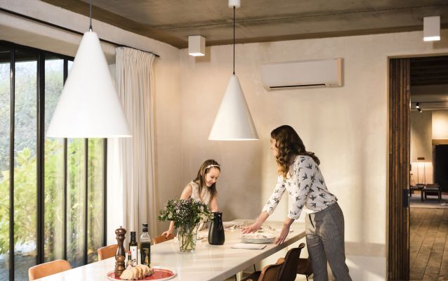 Dank der Verteilung über die Fußbodenheizung bieten die Wärmepumpen neben Heizung in der kalten Jahreszeit Abkühlung in den Sommermonaten. Für die Beheizung wird ein minimaler Einsatz an Primärenergie benötigt, da 75 % der Energie aus der Außenluft gewonnen wird. Das moderne Design der Daikin Altherma 3 in Weiß oder Silbergrau wurde 2018 mit dem iF Design Award und dem Reddot Award ausgezeichnet.