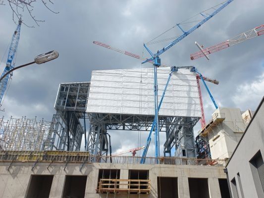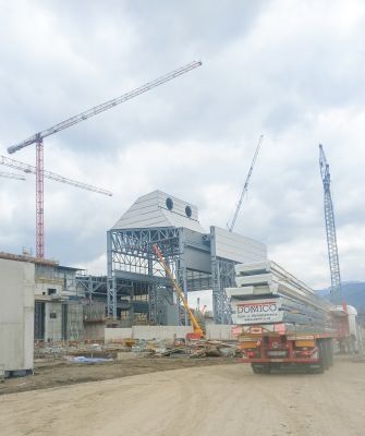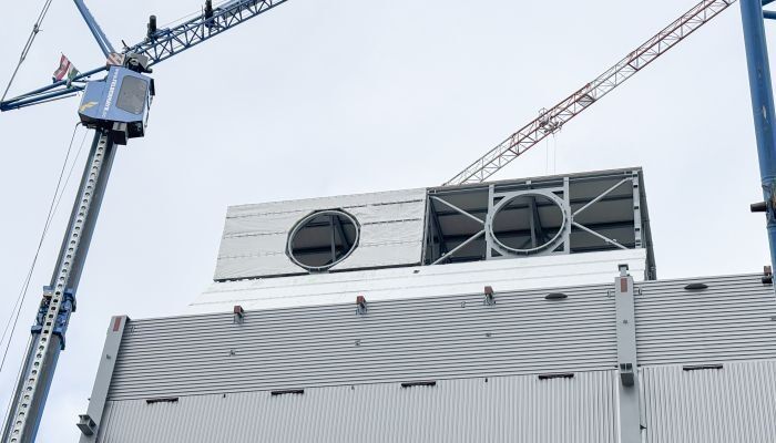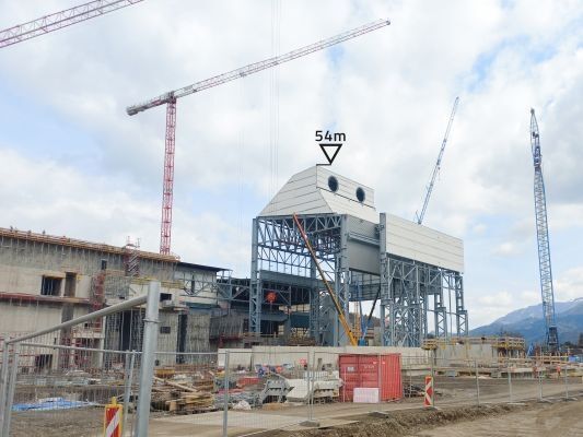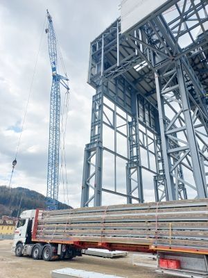 Trotz komplexem Stahlbau, eingeschränkter Zugänglichkeit und Höhen von bis zu 58 Metern verläuft die Montage reibungslos. Selbst hohe Schneelasten von über 5 kN/m² stellen kein Problem dar. Besonders innovativ: Die modulare Errichtung der Legierungshalle. Auf engem Raum werden vor Ort 14 m hohe Module vormontiert – inklusive Stahlkonstruktion und Domitec®-Elementen – und anschließend millimetergenau eingehoben. Dies erfordert eine präzise Koordination mit anderen Gewerken.