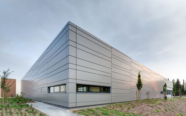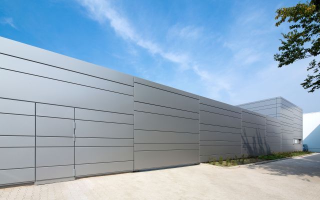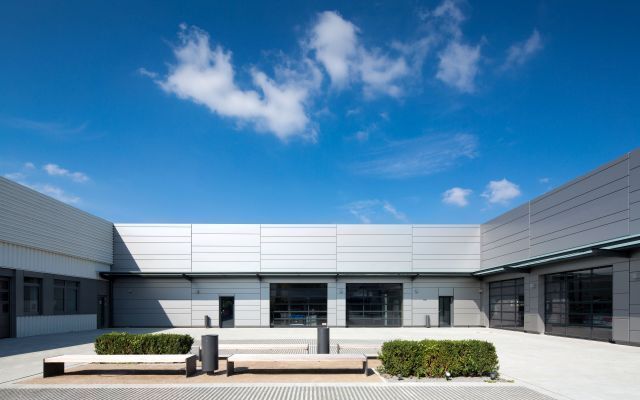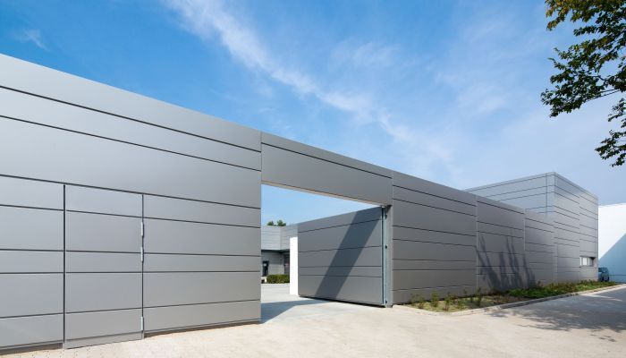 Die vorgehängte, hinterlüftete Metallfassade von DOMICO orientiert sich am Erscheinungsbild des Bestands und wird in der Wand um den Innenhof fortgesetzt. Das Tor der Einfahrt unterstreicht die einheitliche Wirkung, indem es sich in Material und Optik perfekt in die Wand integriert. Es wird so eine sowohl moderne als auch elegante Atmosphäre geschaffen, die das Image des Konzerns aufnimmt und architektonisch weiterentwickelt.