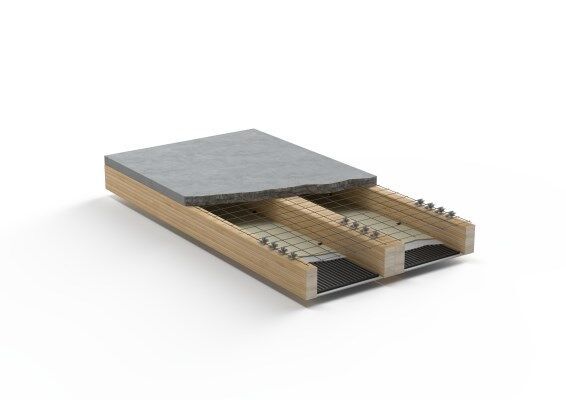 Die Hybrid-Balkendecke (HYB-B) COOL II setzt sich aus der oben liegenden Betonebene und darunter angeordneten Holzbalken zusammen. Zwischen den Balken werden die Kühlelemente angebracht.
