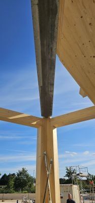 Für die Tragstruktur des Gebäudes kommt ein innovatives Deckensystem von Oberndorfer Hybrid Systems zum Einsatz. Die rund 2.300 m² Hybrid-Flachdecke bestehen aus Brettschichtholzdielen kombiniert mit einer schlanken Betonschicht von nur 8 cm. Je nach statischer Anforderung wurden Aufbauhöhen von 16 cm BSH + 8 cm Beton bzw. 20 cm BSH + 8 cm Beton realisiert.