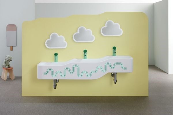 Die Waschlandschaften aus dem porenfreien, hygienisch fleckenbeständigen und lebensmittelechten Mineralwerkstoff Varicor sind in drei verschiedenen Breiten und frischen Farben erhältlich. Dank unterschiedlicher Höhen passt der Waschplatz für verschiedene Altersgruppen. Die neuen Geberit Bambini Waschtischarmaturen sind als Einhebelmischer in einer Farbpalette von frischen Pastelltönen bis zu kräftigen Farben erhältlich, inspiriert von Natur und Wasser. Die grau/hochglanz-verchromte Variante ist auch mit Infrarotsensor (Batterie oder Netzanschluss) erhältlich.