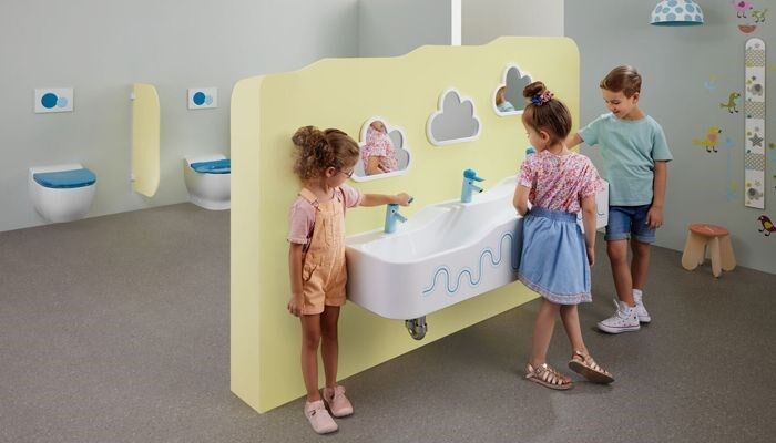 Die Zugänglichkeit und kindgerechte Gestaltung des Sanitärbereichs sind entscheidend für die Hygieneerziehung von Kindern. Geberit Bambini bietet spezielle WC- und Waschplatzausstattungen, die auf die Bedürfnisse von Kleinkindern und Kindern bis 14 Jahren abgestimmt sind. Sie zeichnen sich durch ihre Vielseitigkeit und Anpassbarkeit aus, um unterschiedlichen Altersgruppen gerecht zu werden. Das kindgerechte Design in frischer Farbwahl führt die Kinder spielerisch an das Thema Hygiene heran. Gleichzeitig erleichtern diese Lösungen den Erziehenden die spielerische Vermittlung von Hygieneprinzipien an die Kinder. Die einfache Installation und die leichte Reinigung tragen zur Alltagstauglichkeit in Kindergärten, Kindertagesstätten und Schulen bei. Die Bambini Serie wurde 2024 mit dem iF Product Design Award ausgezeichnet. Die Produkte der Badserie überzeugten die Jury unter anderem mit der Formgebung, die besonders kindgerecht und gleichzeitig modern ist.
