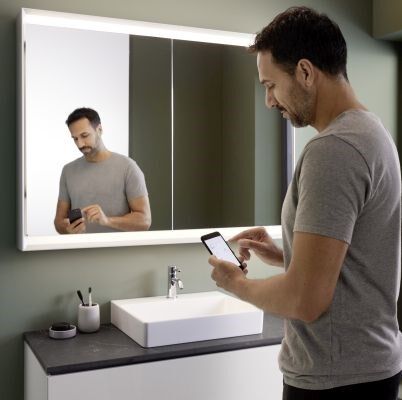 Die Beleuchtung lässt sich nicht nur über den berührungssensitiven Lichtsensor direkt am Spiegelschrank anpassen, sondern auch klassisch über einen Raumtaster oder -schalter. Via Geberit Home App lassen sich sämtliche Einstellungen bequem und digital vornehmen - beispielsweise verschiedene Lichtstimmungen festlegen oder entsprechende Zeitfenster einstellen. Dabei können Beleuchtungsstärke, das Einschalten, das Dimmen, die Veränderung der Farbtemperatur und das Ausschalten programmiert werden. Zudem bietet ComfortLight vier vorprogrammierte Modi: Orientierungslicht, Kerzenlicht, Standardlicht und Arbeitslicht.