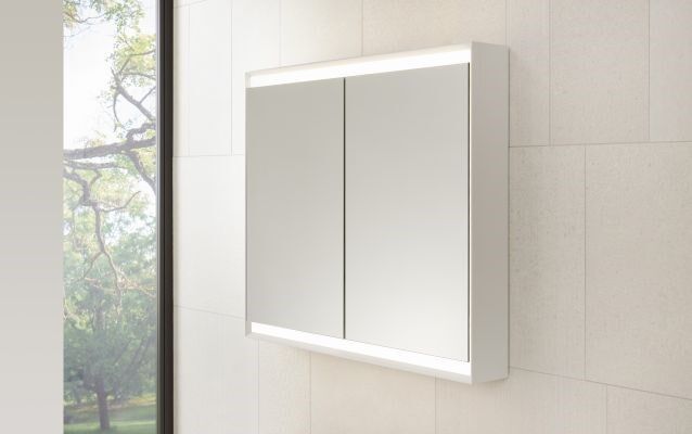 Die Spiegelschränke besitzen eine komfortable Höhe von 90 cm, sind in fünf verschiedenen Breiten von 60 cm bis 120 cm und wahlweise mit einer beleuchteten Nische unterhalb der verspiegelten Türen verfügbar. Die Rahmenfarbe ist wahlweise Aluminium eloxiert oder weiß. Zwecks individueller Stauraumgestaltung hält der Spiegelschrank drei hochwertige und stufenlos verstellbare Glasablagen parat. Im Inneren befinden sich zudem zwei Steckdosen. Die Maße des Spiegelschranks sind an die Breiten der neuen Geberit ONE Waschtische und Möbel angelehnt und lässt sich daher optimal damit kombinieren. Natürlich ist er aber auch mit allen anderen Geberit Badserien kombinierbar oder als Einzellösung montierbar.