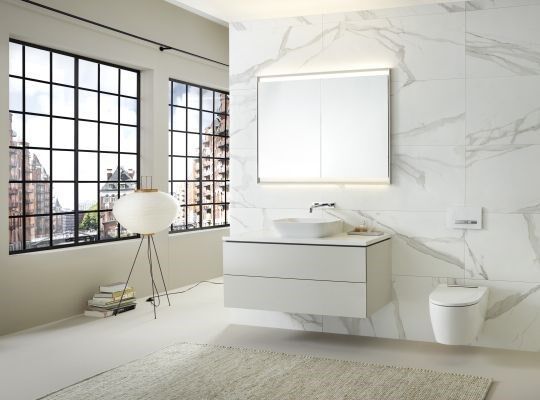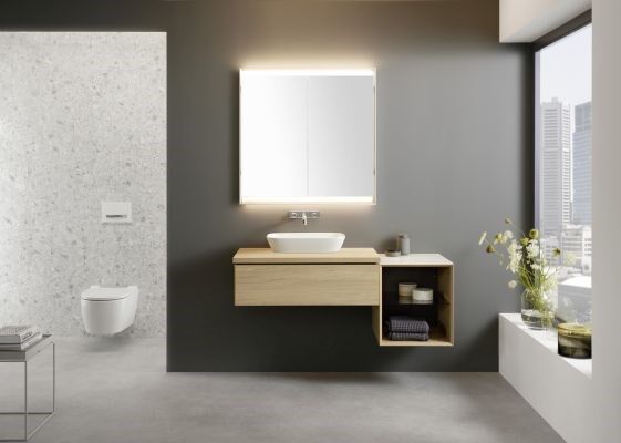 Der Spiegelschrank ist ab April 2022 erhältlich und kann mit allen Badserien von Geberit kombiniert werden. Das Geberit ComfortLight im ONE Spiegelschrank passt sich den Bedürfnissen der Nutzerinnen und Nutzern exakt an. Für die individuelle Beleuchtung sorgen vier in den Spiegelschrank integrierte, aufeinander abgestimmte Lichtquellen. Wird natürliches, blendfreies Licht ohne Schattenwurf gewünscht, beleuchtet der Geberit ONE Spiegelschrank den Waschplatz und den Raum indirekt über die Decke - so wirkt gleichzeitig der gesamte Raum plastisch und größer. Zudem lässt sich das Licht von hellem, kühlerem Licht bis hin zu dunklerem, wärmerem Licht stufenlos dimmen.