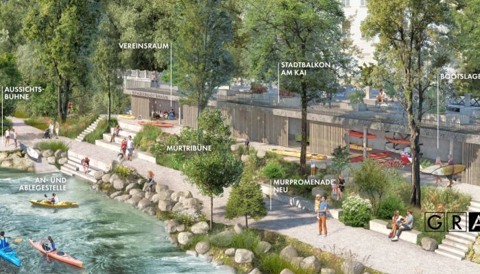 Um eine geeignete Lösung für diesen zentralen Standort zu finden, wurde ein Architekturwettbewerb ausgelobt, den die junge steirische Architektin, DI. Nina Kuess, mit ihrem Team für sich entschied. Das Architektenteam hat – von der Mur inspiriert - die gesamte Anlage in die Hanglandschaft am Ufer eingebettet, und sowohl die bestehende Murpromenade, die Grünzonen als auch die Zugänge über den Marburgerkai integriert. Die Errichtung des Gebäudes wurde im Einklang mit dem Denkmalschutz und der Altstadtsachverständigenkommission und mit größtmöglicher Rücksicht auf Naturschutz und Wasserrecht durchgeführt.