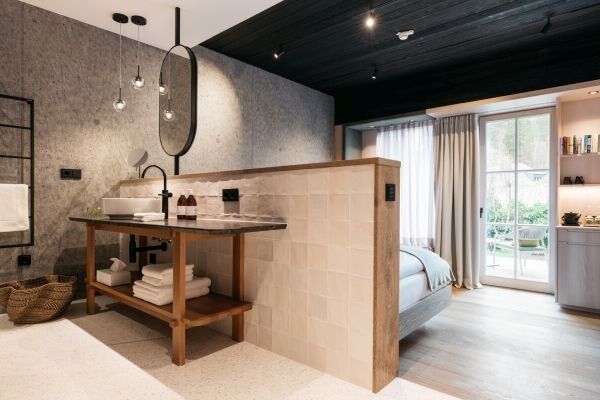 Individuelles Design, hohe Qualität und zeitgemäßer Komfort: Das waren auch bei der Sanitärausstattung die Kriterien, die Geberit mit seinen Sanitärprodukten erfüllt. Auf den maßangefertigten Möbeln aus Holz, Stein oder Stahl sitzt in jedem Badezimmer ein Geberit VariForm Waschbecken. CleanLine Duschrinnen von Geberit übernehmen die die Entwässerung der großzügigen bodenebenen Duschen. Für die modernste persönliche Hygiene am WC sorgen in jedem Gästezimmer Geberit AquaClean Dusch-WCs. Auch in der Wand kommen Geberit Rohrsysteme für die Wasserversorgung und die Entwässerung zum Einsatz. In den öffentlichen Bereichen des Hotels wählten die Bauherren Geberit ONE WCs und Urinale aus, da diese Produkte für den Hotelbetrieb wegen der einfachen Reinigung und Instandhaltung sowie der langen Ersatzteilgarantie von 25 Jahren besonders geeignet sind.