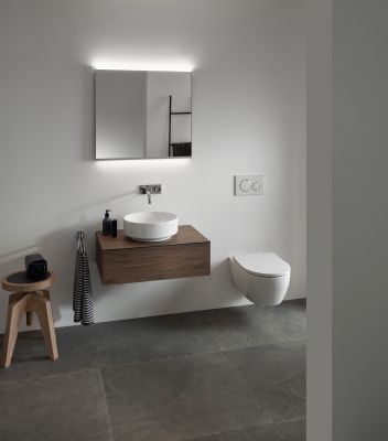 Der Spiegel Geberit Option Plus rückt jede Benutzerin und jeden Benutzer sowie den Waschplatz selbst ins rechte Licht. Zwei zentralen Lichtelemente sorgen für optimale Ausleuchtung. So beleuchtet eine Lichtleiste die Decke und die Wand oberhalb des Spiegels, die zweite beleuchtet den Waschplatz selbst.