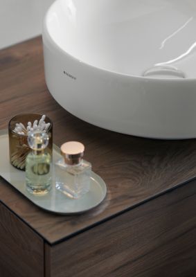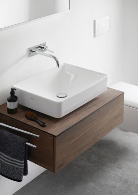 Im Zusammenspiel von VariForm Aufsatzwaschtisch und Badmöbel kommt die ruhige, dezente Designsprache voll zur Geltung. Die filigrane schwarze Umrandung setzt die Ablagefläche aus langlebigem Kompaktlaminat optisch in Szene. Im Inneren überzeugt der großzügige Stauraum: Die Schubladen sind ohne Siphonausschnitt gestaltet, wodurch der Innenraum optimal nutzbar wird.