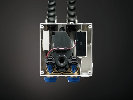 Mit Ausnahme des Infratorsensors sind sämtliche Funktionsteile des neuen Systems wie Steuerung, Mischer, Ventile und die Energieversorgung in einer separaten, 14 cm x 14 cm kleinen Funktionsbox untergebracht. Diese wird gut zugänglich unter dem Waschtisch in die Vorwand eingebaut und befindet sich dadurch außerhalb der Nasszone. Alternativ gibt es eine robuste Funktionsbox für die Aufputzmontage.