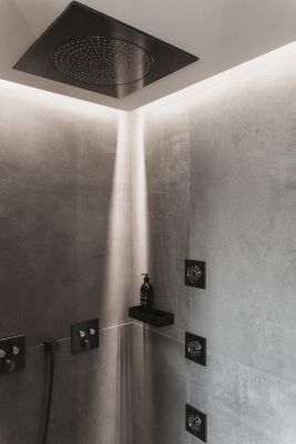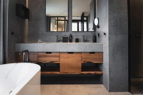 Perfekt auf das Wohnkonzept des Hotels abgestimmt, bieten auch die Badezimmer hohen Komfort und exquisites Design. So fügen sich die Armaturen, Betätigungsplatten und dazugehörigen Accessoires der Linie GROHE Essence in der modernen Farbe Hard Graphite ideal in den geradlinigen Stil mit Erd- und Grautönen ein. Die Produkte in edlem Anthrazit eignen sich ideal für den urbanen Einrichtungsstil und sind in polierter oder gebürsteter Ausführung erhältlich. Für einen Blickfang und besondere Wohlfühlmomente sorgt die in den Suiten verbaute freistehende GROHE Essence Badewanne. Auch im Spa Bereich können die Gäste dank Rainshower Duschsystem mit SmartControl Bedienung und individuell einstellbaren Strahlarten wunderbar entspannen. Eine besonders edle Optik bieten dabei die extra für dieses Projekt in Hard Graphite angefertigten Deckenbrausen.