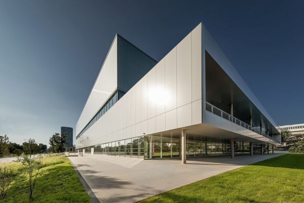 Der gestapelte Baukörper aus zwei zueinander gedrehten Volumina spiegelt die Geometrien der drei Hallen wider, die prägnante Silhouette stärkt den Campus-Charakter zwischen ErnstHappel-Stadion und Prater. Den EU-weiten Wettbewerb 2021 gewann das Wiener Büro Karl und Bremhorst Architekten (kub a).