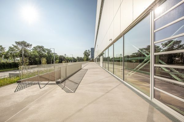 Architektonisch prägen robuste, wartungsarme Hüllenmaterialien und transluzente Elemente das Bild. Fassaden aus Alucobond und Polycarbonat sorgen für helles Innenlicht und eine differenzierte Außenwirkung. Die Fassadenflächen umfassen rund 9.000 m².