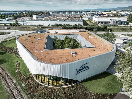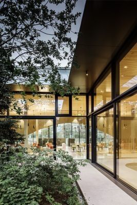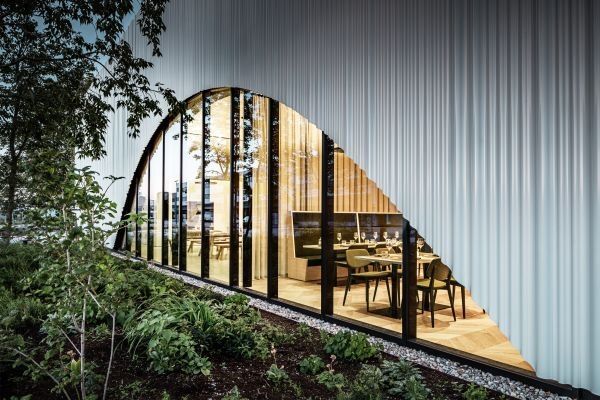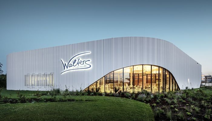 Das Restaurant "Walters", konzipiert als moderne Landmark im WALTER BUSINESS-PARK, beeindruckt durch seine außergewöhnliche Architektur. Der Grundriss des Gebäudes – ein Vieleck mit abgerundeten Ecken – wurde von dreiplus Architekten aus den Grenzlinien des Grundstücks entwickelt. Im Zentrum der Anlage entstand ein 360 m² großer Innenhof-Wald, der die Gäste mit frischer, kühler Waldluft versorgt. Großflächige, elektrisch steuerbare Glasfronten ermöglichen das wetterabhängige Öffnen des Innenhofs.