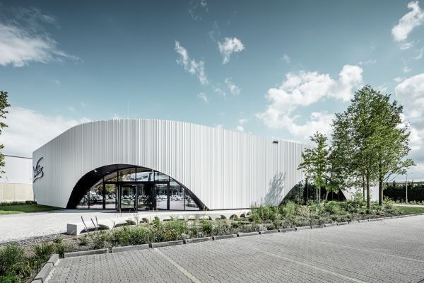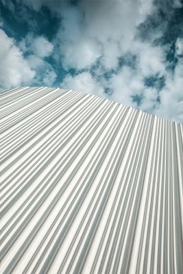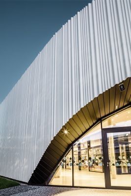 Der optisch fließende Eindruck der Gebäudehülle ist das Ergebnis einer Fassade aus Individualprofilen. Diese Profile besitzen unterschiedlich hohe Wellenquerschnitte, die nahtlos in scheinbar willkürlicher Reihenfolge verlegt wurden und den Eindruck erwecken, endlos in den Himmel zu streben.