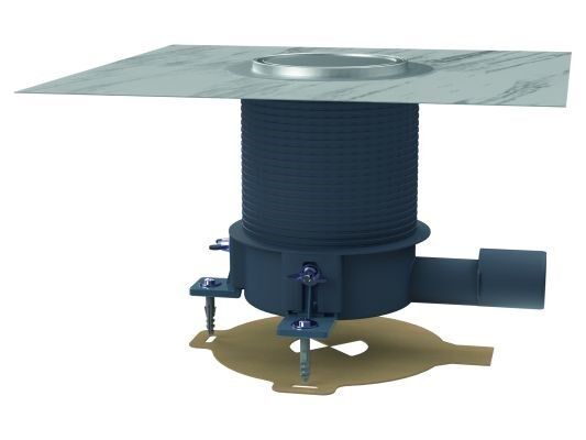 Die Montage des Grundkörpers erfolgt mit drei Befestigungswinkeln und Schrauben auf der Rohbetondecke. Eine mitgelieferte Schablone erleichtert die genaue Positionierung. Nach dem Einbringen des Estrichs kann der Grundkörper bündig abgeschnitten werden, um Änderungen im Bodenaufbau oder Materialdicken zu berücksichtigen.