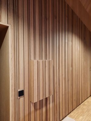 Dies gelang nicht zuletzt dank eigens entwickelter, diagonal geknickter Deckensegel, deren Ausrichtung sich via horizontaler Drehachse variabel gestalten lässt, sowie mit Absorber-Paneelen von RPG (in Lizenz bei Hutter produziert) und Diffusoren. Allfällige Reflexionen durch Glasflächen lassen sich dank dreh- und verschiebbarer Holzlamellen abschotten.