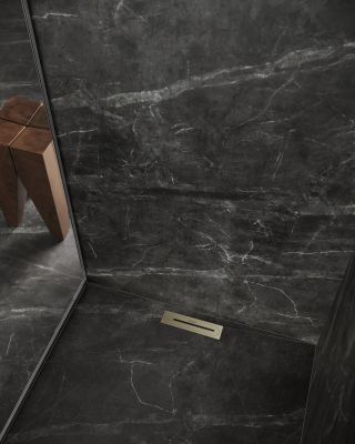 Bodenseitiger Gesamtaufbau (Fliese, Fliesenkleber, Abdichtung) von 11 mm bis 28 mm, auch für fugenlose Böden geeignet
