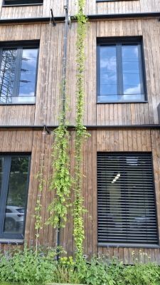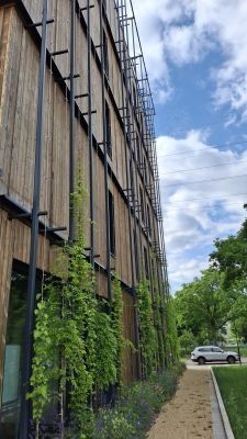 Besonderes Augenmerk verdient die Fassade: Sie kombiniert Kebony Character – ein modifiziertes Echtholz mit außergewöhnlicher Dauerhaftigkeit – mit einem vertikalen Begrünungskonzept. Die holzverkleideten Flächen ruhen auf einem filigranen Stahlgerüst, das Rankpflanzen Halt bietet und bis zu 26 % der Oberfläche in eine grüne Klimazone verwandelt. Der Effekt: reduzierte Wärmebelastung, ein verbessertes Mikroklima und eine lebendige, dynamische Gebäudehülle, die im Stadtraum sichtbar Haltung zeigt.