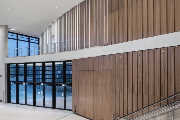 Die echtholzfunierten Platten eignen sich hervorragend für Bereiche mit erhöhten baulichen Anforderungen. Die Paneele werden in der firmeneigenen Produktion hergestellt und sind als systemunabhängige, dekorative Bekleidungen in Fluchtwegen und notwendigen Fluren sowie in Treppenhäusern und Veranstaltungsräumen eingesetzt.