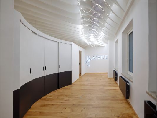 Ein zentrales Gestaltungselement stellen die geschwungenen Lindner MUTE+® Baffeln dar: In den Fluren verschmelzen sie mit maßgeschneiderten Lichtobjekten zu einem architektonischen Kunstwerk, das von wellenförmigen LED-Leuchten und außergewöhnlichen Lichtskulpturen von Dr. Christoph Müller (bewegende Architektur e.U.) eindrucksvoll in Szene gesetzt wird. Zusätzlich schaffen knapp 400 unterschiedlich hohe Akustikzylinder im Foyer nicht nur ein markantes Design, sondern reduzieren auch den Geräuschpegel deutlich – für mehr Ruhe und Konzentration.
