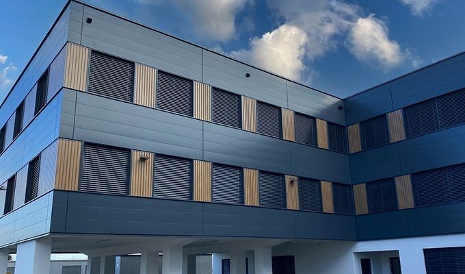 Für die Gestaltung der Fassade wurden 3.073 Quadratmeter MONTALINE® ML 26/500 in RAL 7016 sowie 427 Quadratmeter MONTAFORM® Design Individuell in Vintage Oak verbaut (Fassadenbauer: Unger Stahlbau Ges.m.b.H., Oberwart)