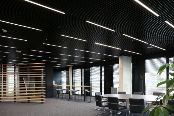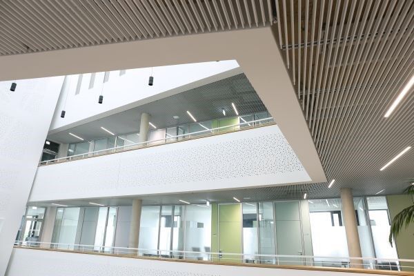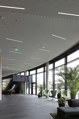 Im Deckenbereich kam NE Nagelstutz und Eichler mit seinem Lamellendeckensystem aus extrem leichten Aluminum zur Ausführung. Auf rund 5.000 Quadratmetern sorgt die NE Lamellendecke in weisser und schwarzer matter Optik für die Fortführung der linearen Haptik des Gebäudeköpers. Der deutsche Hersteller konnte zusätzlich mit seinem Zubehörprogramm (Revisionsklappen und Modulplatten) sowie Verlegevorteilen punkten und sich gegenüber vergleichbaren Mitbewerbern durchsetzen. Interessantes energetisches Merkmal:
