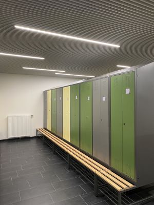 Nagelstutz und Eichler bietet ein breites Zubehör-Programm wie Revisions-Klappen in Abmessungen bis 2.000 x 2.000 mm und mit verschiedenen Verschlussvarianten oder passende, anschlussfertige LED-Systemleuchten an. Zudem sind Systemkomponenten (Modulplatten, Randwinkel und Kantprofile in Profilfarben lieferbar. Die Lamellendecken eigenen sich auch für den Einsatz im Schwimmbadbereich. Bonus: flexible Draht- oder Noniusabhängungen.
