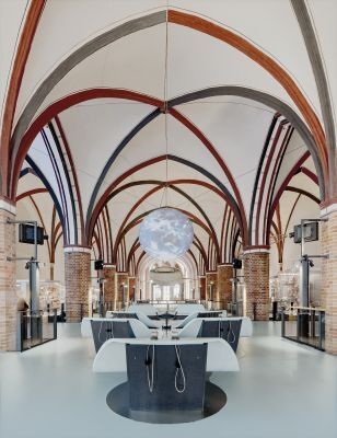 Die Bodenbeläge wurden gezielt auf die Atmosphäre des Raums und die Materialpalette des Bestands abgestimmt. Die Architekten wählten noraplan unita, der durch seine interessante Materialkombination aus Kautschuk und eingestreuten Granitsplittern hervorsticht. Dieser wurde in zwei unterschiedlichen Farben unverfugt verlegt, sodass die Flächen wie aus einem Guss wirken. Ein pastelliges Grün sorgt für eine ruhige Grundstimmung und lässt den Raum wirken, ohne sich in den Vordergrund zu drängen. Um gezielte Akzente zu setzen und den Besucher subtil durch die Ausstellung zu leiten, kam ein dunkles Meeresgrün zum Einsatz. Beide Farbtöne sind harmonisch auf die bestehende Farbwelt des historischen Gebäudes abgestimmt. Sie nehmen subtil Bezug auf maritime Themen und betonen die denkmalgeschützten Elemente wie gotische Pfeiler, Gewölbe und Natursteinwände, ohne mit ihnen zu konkurrieren. So bleiben die Würde und die Atmosphäre der ehemaligen Klosterkirche spürbar.
