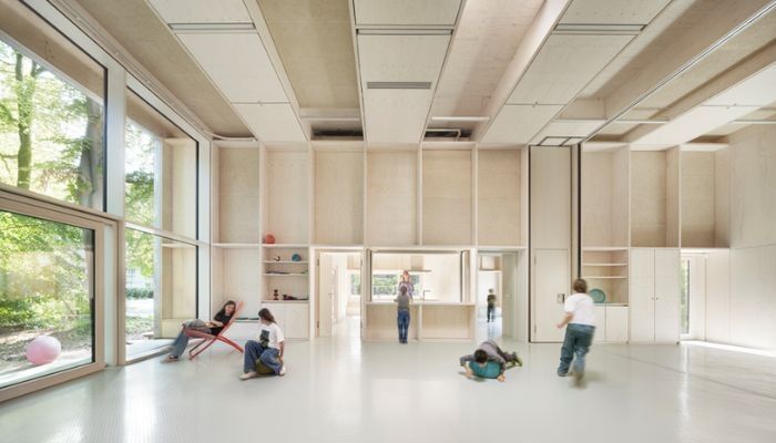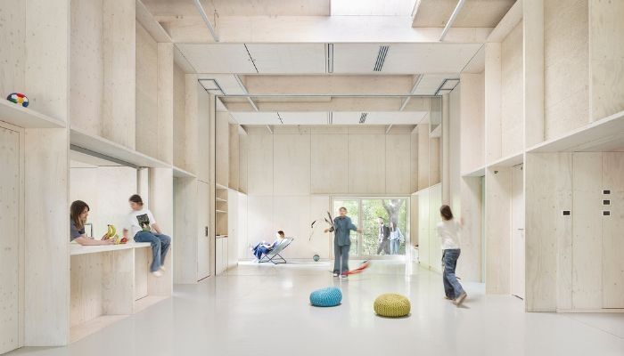 Der im Oktober 2025 eröffnete Moabiter Kinderhof in Berlin versteht sich als offenes Haus für den Alltag von Kindern und Jugendlichen im dicht bebauten Stadtraum. Kersten Kopp Architekten reagierten auf den besonderen Ort zwischen Park und Quartier mit einem Gebäudeensemble, das aus mehreren, an Spielklötze erinnernden Kuben besteht und sich harmonisch zwischen den gewachsenen Baumbestand schiebt. Der Neubau wurde in Holzbauweise realisiert; sein Tragwerk setzt sich aus vorgefertigten Modulen zusammen, die im Werk produziert und auf der Baustelle montiert wurden. Die Architektur wird dabei als Rahmen für Offenheit, Partizipation und Orientierung verstanden. Dieses Leitprinzip setzt sich konsequent in der Materialwahl fort: In den Innenräumen bildet der Noppenbelag norament 926 das passende Fundament für das ständige Rein und Raus der Kinder zwischen Spielhof und Haus.