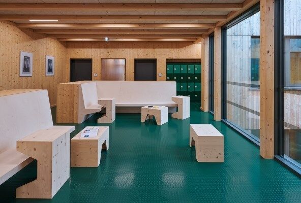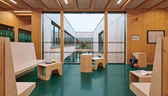 Eintreten und Wohlfühlen – mit seiner hochwertigen Holzbauweise und der erstklassigen Innenausstattung bietet der Erweiterungsbau der Hildburgschule im deutschen Rinteln eine angenehme, inspirierende Lernumgebung. Für seine zukunftsweisende und klimaschonende Architektur wurde die vom Stuttgarter Büro Bez+Kock geplante Schule 2022 mit dem 1. Platz beim Holzbaupreis Niedersachsen ausgezeichnet und war unter den vier Finalisten des Deutschen Nachhaltigkeitspreises für Architektur 2022. Hohe Qualitätsmaßstäbe legten Planer und Nutzer auch bei der Innenausstattung an. Mit dem norament 926 Noppenbelag entschieden sie sich für ein außergewöhnliches Boden-Design, das konsequent auf rund 5.000 Quadratmetern umgesetzt wurde. Für die „nora Noppe“ sprach neben ihrer Robustheit und dem ikonischen Look vor allem die Möglichkeit, verschiedene Funktionsbereiche im Schulgebäude einheitlich und gleichzeitig individuell zu gestalten. Das Tafelgrün des Bodens ist eine Sonderfarbe, die speziell für das Projekt am Produktionsstandort in Weinheim hergestellt und auf den Farbkanon der Innenräume abgestimmt wurde.